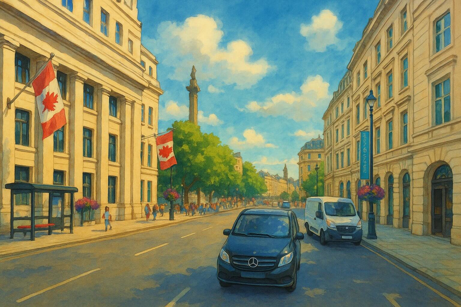 Canada House, the High Commission of Canada to the United Kingdom. This neoclassical building faces Trafalgar Square and serves not just as a diplomatic hub but also as a cultural centre, hosting exhibitions and public events. Its location gives it one of the most enviable views in London.