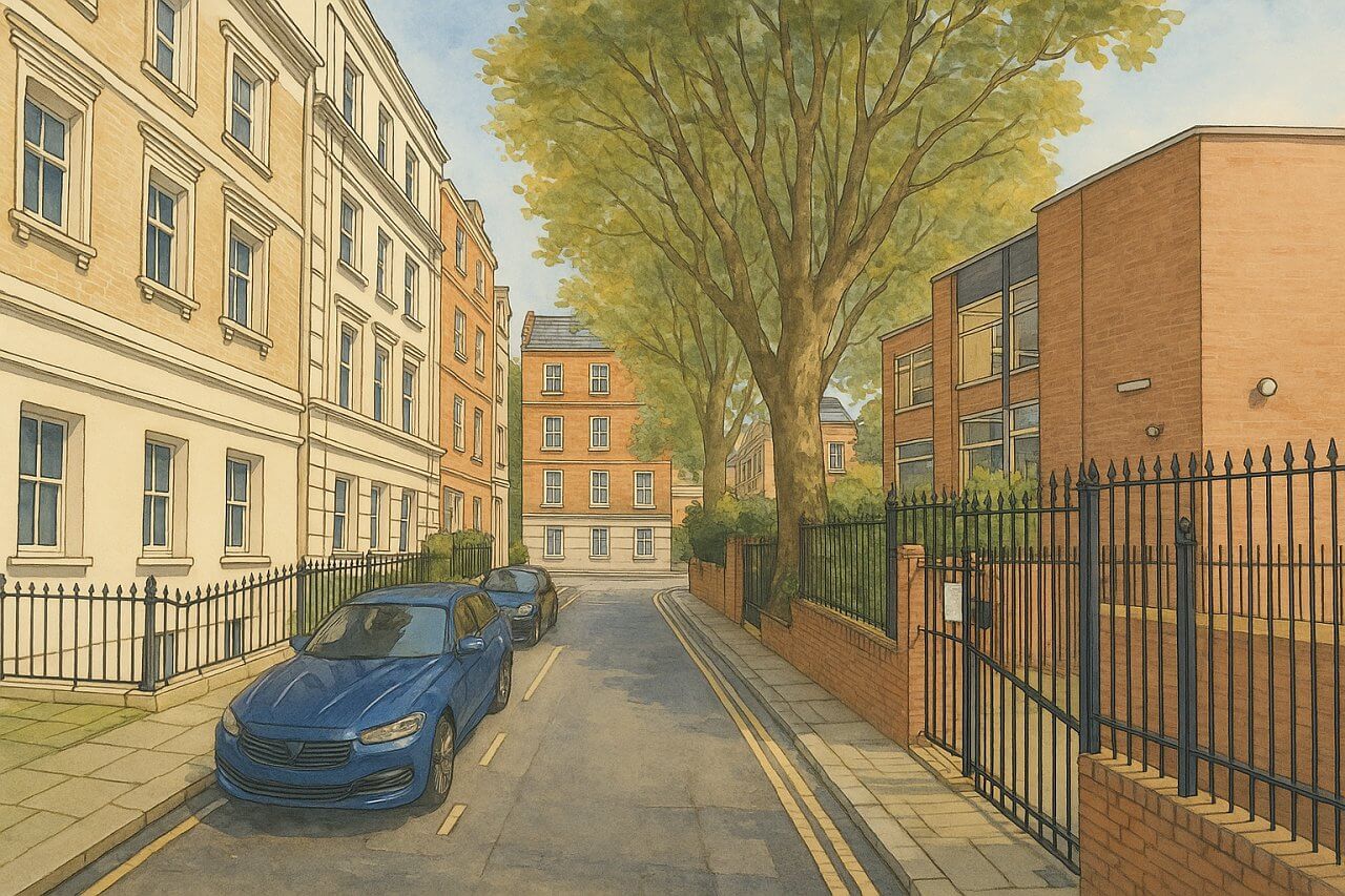 The street benefits from relative quiet despite its central location, owing to its one-way traffic system and its location behind larger roads like Victoria Street. Trees line the pavements, and the general atmosphere is one of understated affluence and urban calm.