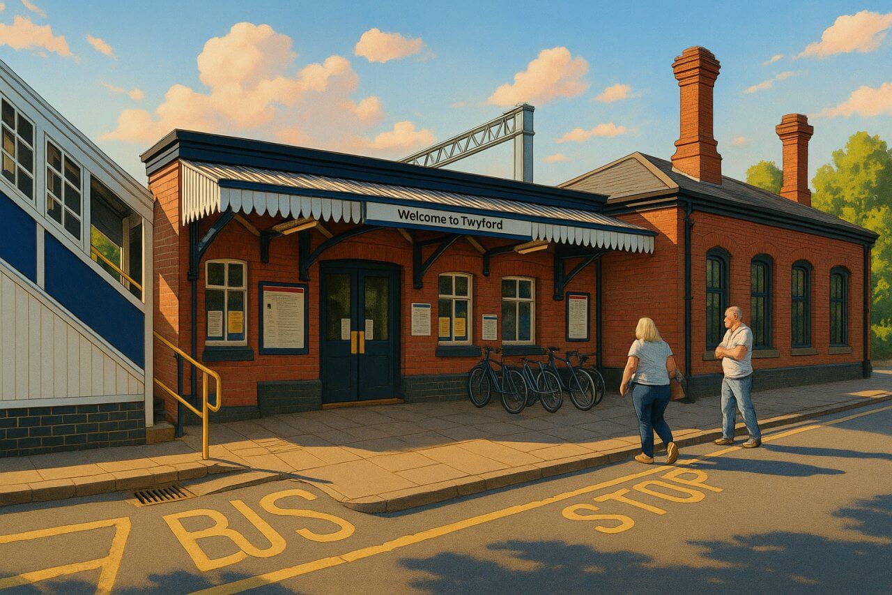 The station sits at the junction of Station Road and Waltham Road in the heart of Twyford village. The main entrance is on Station Road, featuring a modest ground-level station building that houses a ticket office, waiting area, and small convenience kiosk. Additional access is available via a side entrance with ramp access to platforms, making it friendly for those with reduced mobility.