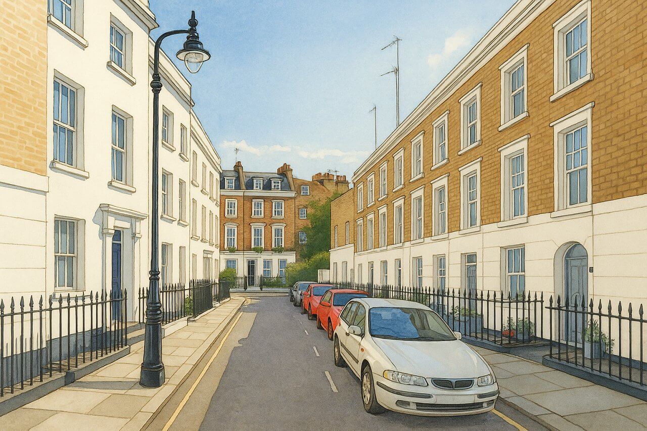 - Character: Quiet residential street with stuccoed Victorian terraces