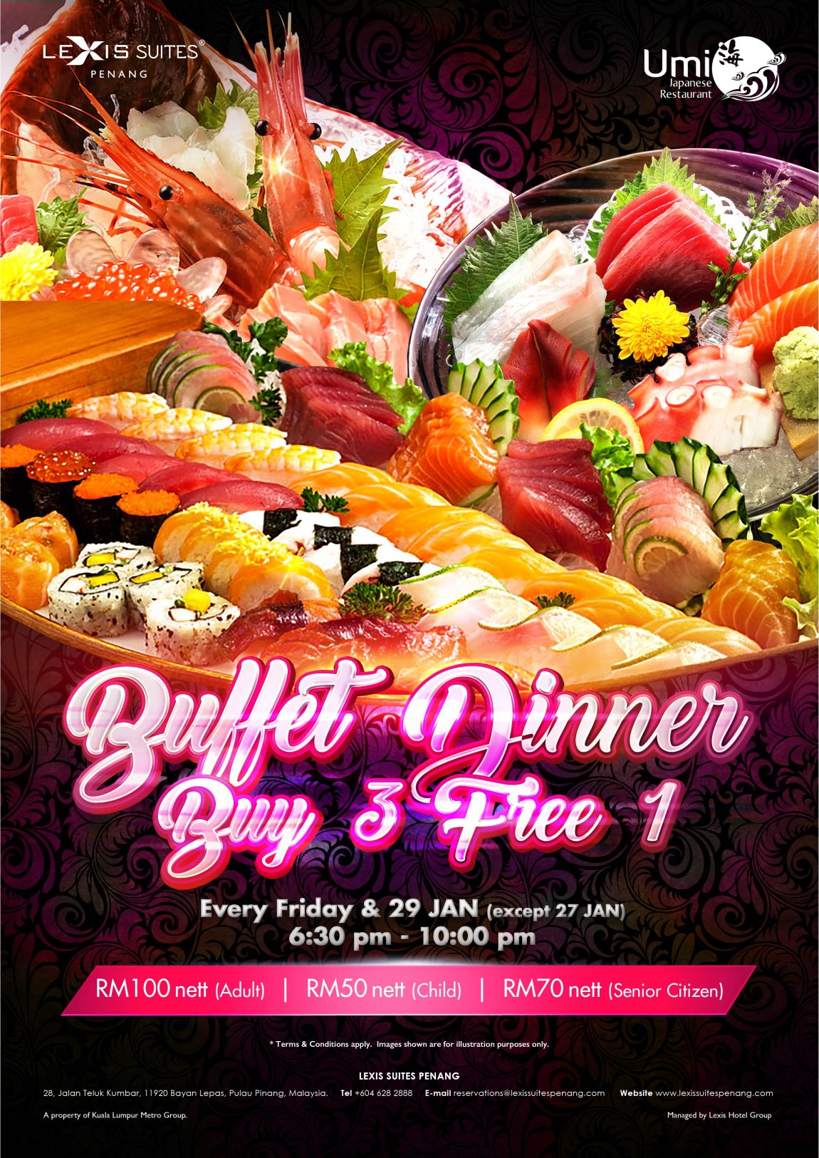 and 29 January (but not on 27 January), from 6:30 pm to 10:00 pm, priced at RM100 nett (adult), RM50 nett (child) and RM70 nett (senior).